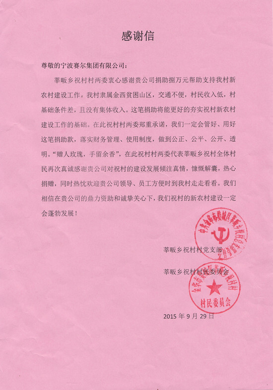 幫助祝村修路,只是近年來我集團履行社會責任的一個側面,也是集團“賽爾愛農(nóng)”慈善基金的最新項目,近年來,“賽爾愛農(nóng)”項目已捐助貴州、麗水、奉化等多地農(nóng)村的老年活動中心、希望小學、村級道路等多個基礎設施項目,累計捐款近400萬元。