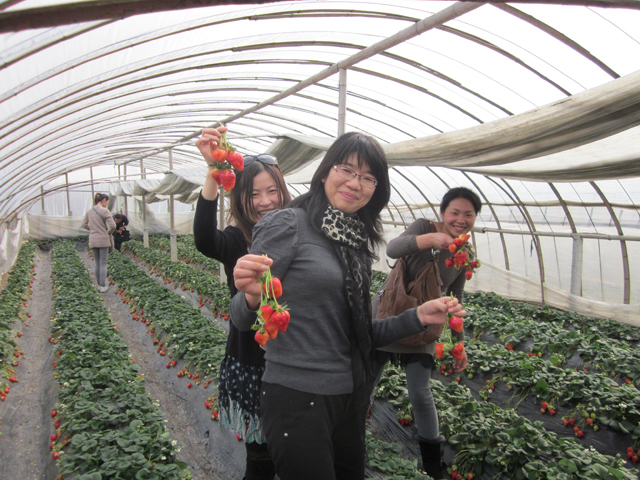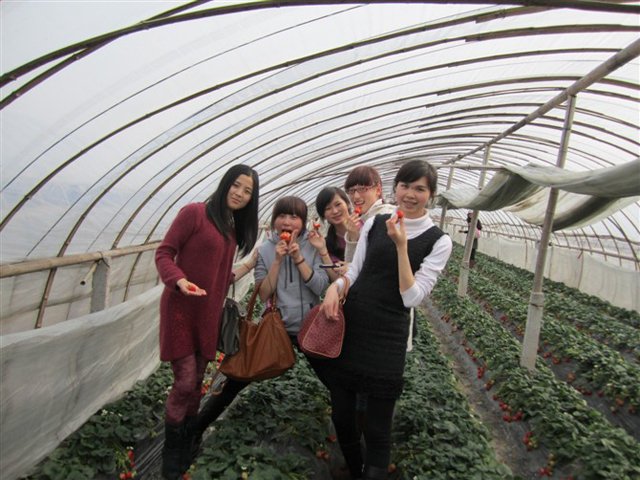 大約下午一點在農(nóng)莊吃過午餐后,大家才陸續(xù)的進入草莓棚??粗锏乩?,小如子彈、大如拇指的草莓,忍不住垂涎欲滴。同事們都很興奮,彎著腰,輕巧地采擷,雖然果實并非個個飽滿,但笑容仍蕩漾在臉上,這場面貌似是一幅畫,染著這個春意正濃的季節(jié)。在夕陽西落前,我們便離開農(nóng)莊前往天一豪食匯,共享饕餮大餐。