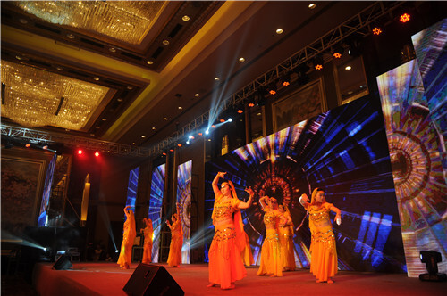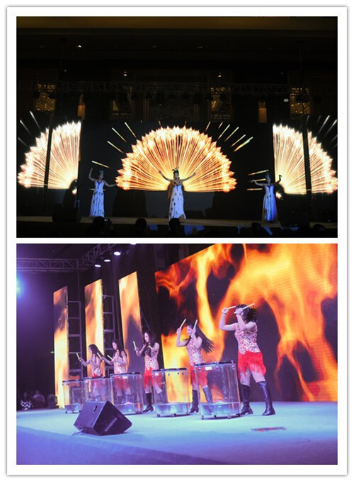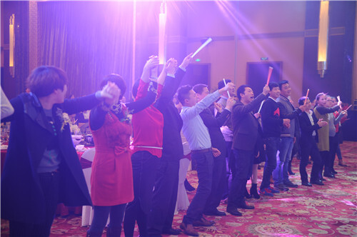 徐總講話結束后,伴隨著全場倒計時的歡呼聲,晚宴在《光耀賽爾》和《中國龍水鼓》中震撼開場。激昂的樂曲,鼓動的節(jié)奏,激情四濺的水花,魅力無限的燈光頻閃,馬上將現場帶入了振奮、喜慶、熱烈的氣氛當中。