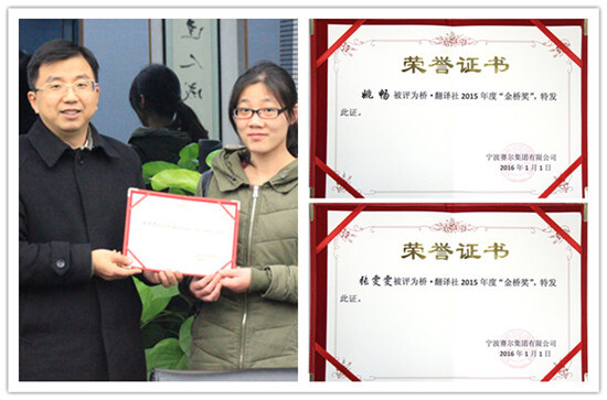 會議最后,為表彰張雯雯和姚暢兩位社員在集團(tuán)外語培訓(xùn)上所作出的貢獻(xiàn),特向她們頒發(fā)了“金橋獎”榮譽(yù)證書,今后,“金橋獎”將成為表彰翻譯社內(nèi)有突出貢獻(xiàn)社員的常設(shè)榮譽(yù)獎項。