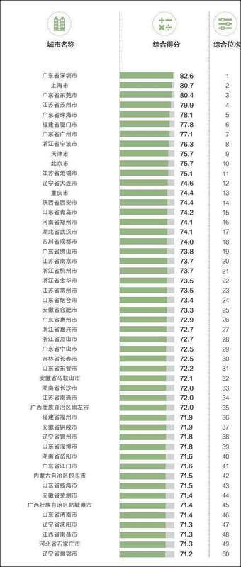 在這份榜單中,深圳、上海、東莞分別占據(jù)綜合排名的前三,其他入圍百?gòu)?qiáng)的浙江城市還有杭州(第21位)、金華(第22位)、嘉興(第27位)、舟山(第28位)、臺(tái)州(第67位)、紹興(第70位)、湖州(第85位)、溫州(第86位)。