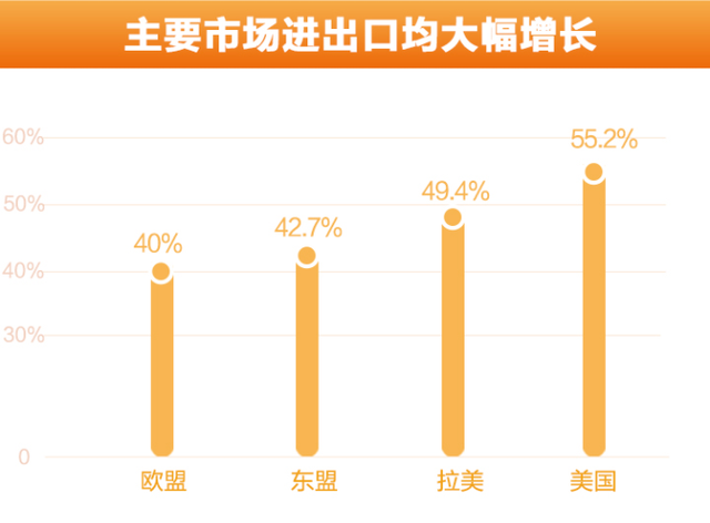 從主要市場(chǎng)來(lái)看,浙江對(duì)主要市場(chǎng)出口、進(jìn)口均實(shí)現(xiàn)大幅增長(zhǎng),歐美對(duì)浙江出口拉動(dòng)作用較大。對(duì)歐盟、美國(guó)、東盟、拉美出口分別增長(zhǎng)40.0%、55.2%、42.7%、49.4%,分別拉動(dòng)全省出口增長(zhǎng)7.5、8.8、4.9、4.4個(gè)百分點(diǎn)。自東盟、拉美、美國(guó)分別進(jìn)口438.4、270.8、160.2億元,增長(zhǎng)32.3%、74.6%、1.4倍,拉動(dòng)全省進(jìn)口增長(zhǎng)5.7、6.2、5.0個(gè)百分點(diǎn)。