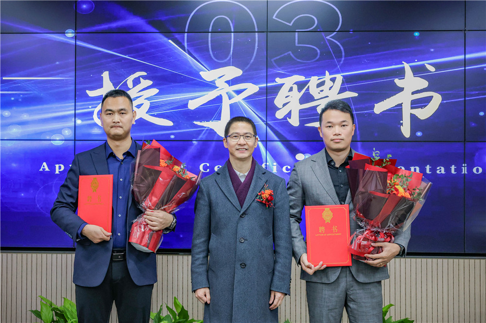 徐平炬董事長為優(yōu)琥和優(yōu)貫事業(yè)部負(fù)責(zé)人頒發(fā)聘書,責(zé)任與期望并肩。